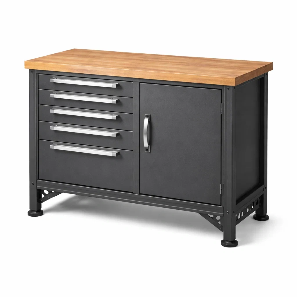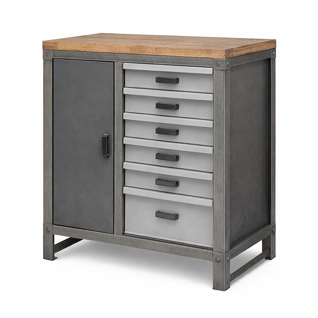 Armoire à outils en acier avec plateau en bois et tiroirs