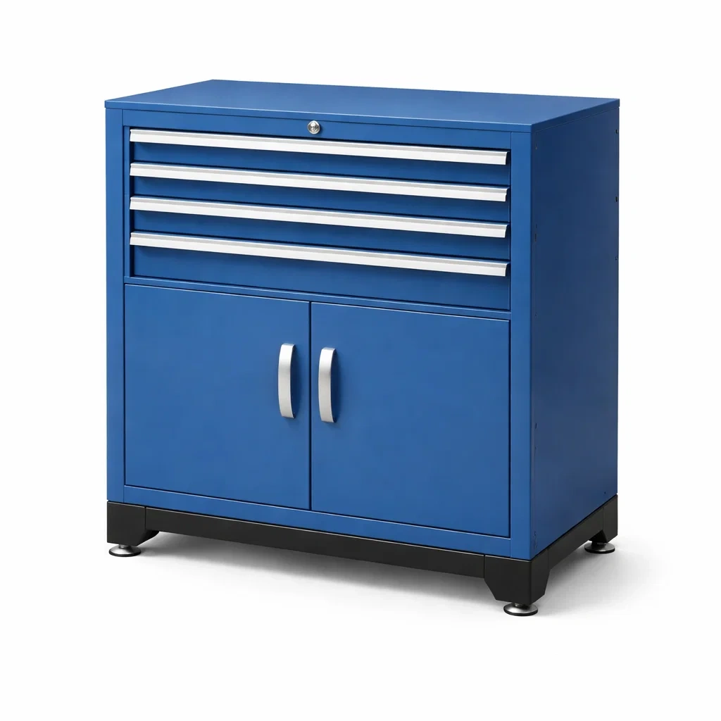 Armoire à outils en métal bleu avec portes et tiroirs