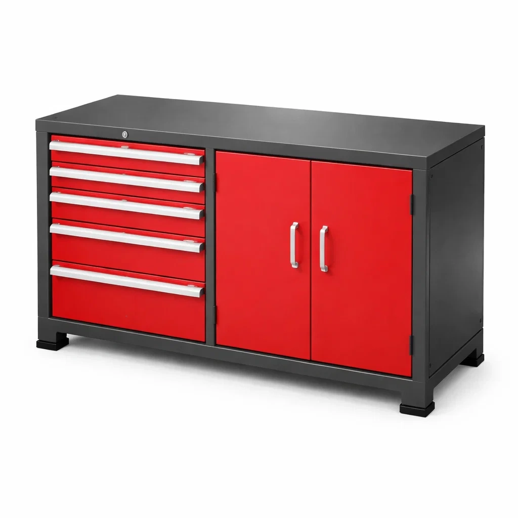 Armoire à outils en acier rouge avec tiroirs et porte