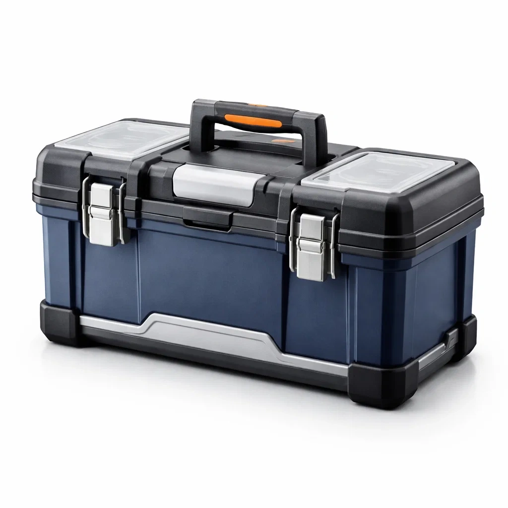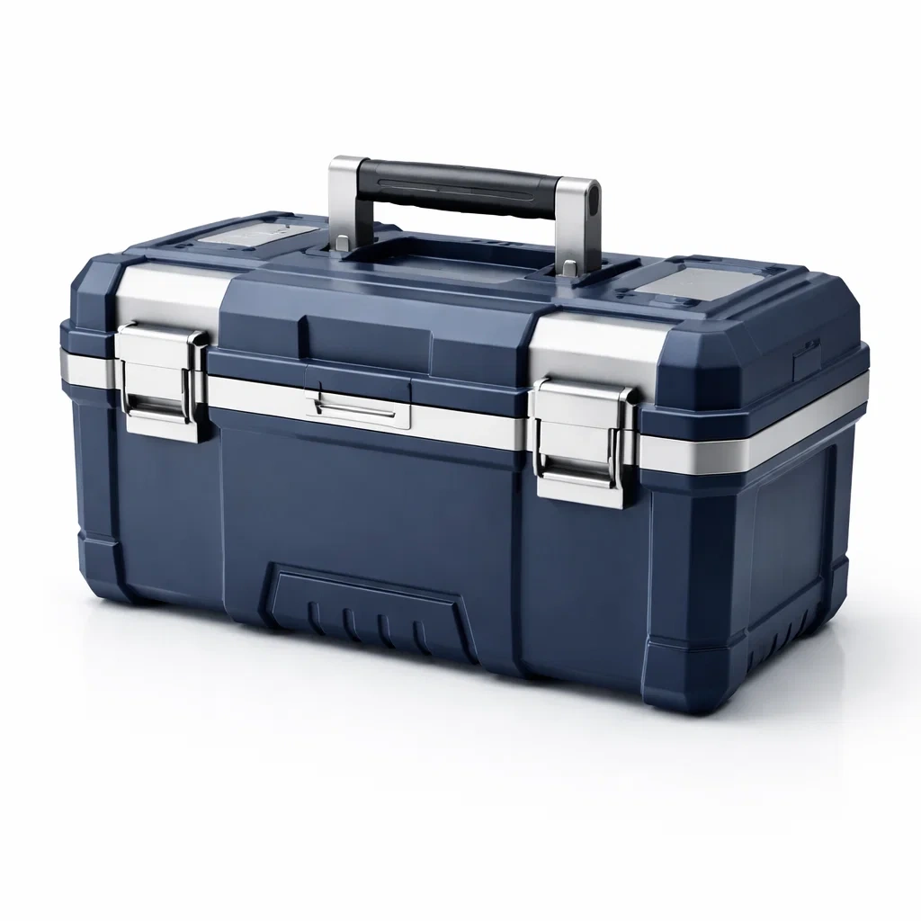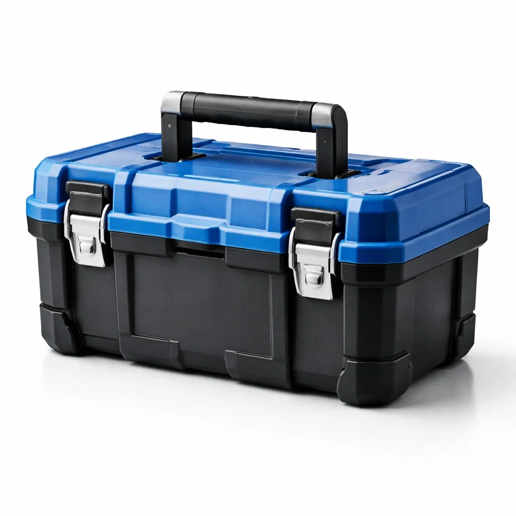 Boîte à outils en plastique bleu avec fermetures métalliques