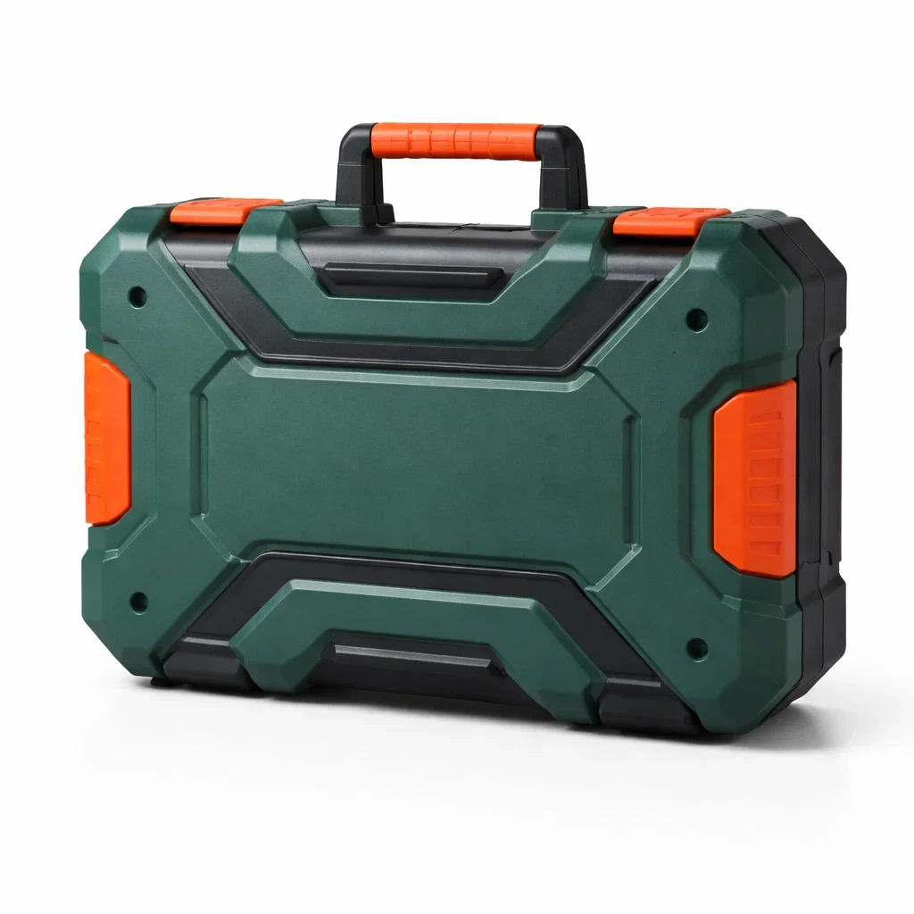 Boîte à outils en plastique ABS vert avec poignées et loquets orange