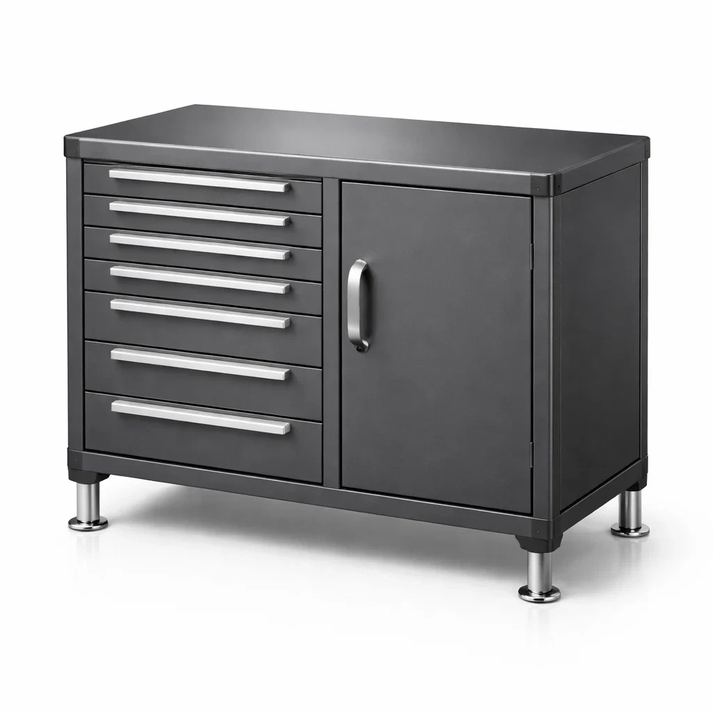 Caractéristiques : 7 tiroirs avec glissières à roulement. 1 porte à charnière avec poignée ergonomique. Poignées en aluminium.