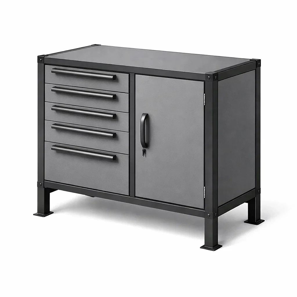 Cette armoire de rangement est fabriquée en acier avec un revêtement en poudre, garantissant résistance et durabilité. Elle mesure 90 cm de longueur, 50 cm de largeur et 85 cm de hauteur, ce qui offre un espace de rangement généreux. Les 5 tiroirs et la porte verrouillable assurent une organisation de vos objets. Conçue pour un usage intérieur, elle doit être maintenue à l'écart des environnements humides.