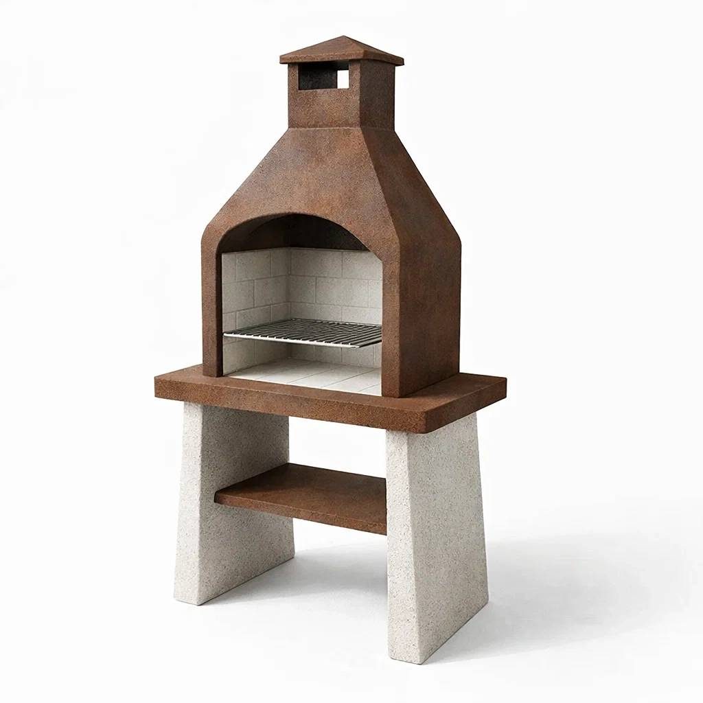 Barbecue extérieur avec structure en métal rouillé et béton.