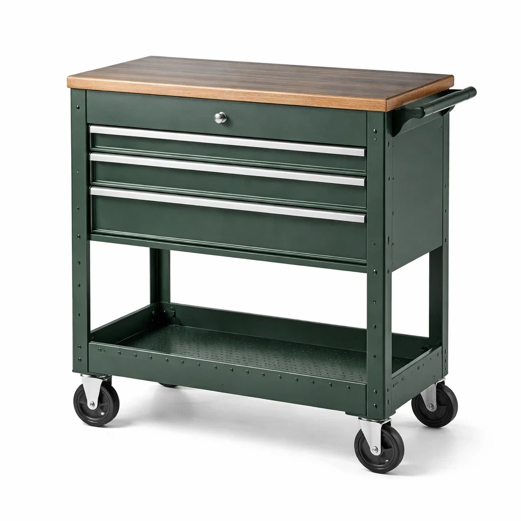 Le chariot d'atelier est conçu avec une structure en acier laqué et un plateau en bois massif. Il dispose de 3 tiroirs, chacun pouvant supporter jusqu'à 50 kg. Les roulettes en caoutchouc permettent une mobilité facile et deux d'entre elles sont équipées d'un système de verrouillage pour plus de stabilité. Ce chariot convient pour une utilisation en intérieur et ne doit pas être exposé à une humidité excessive.