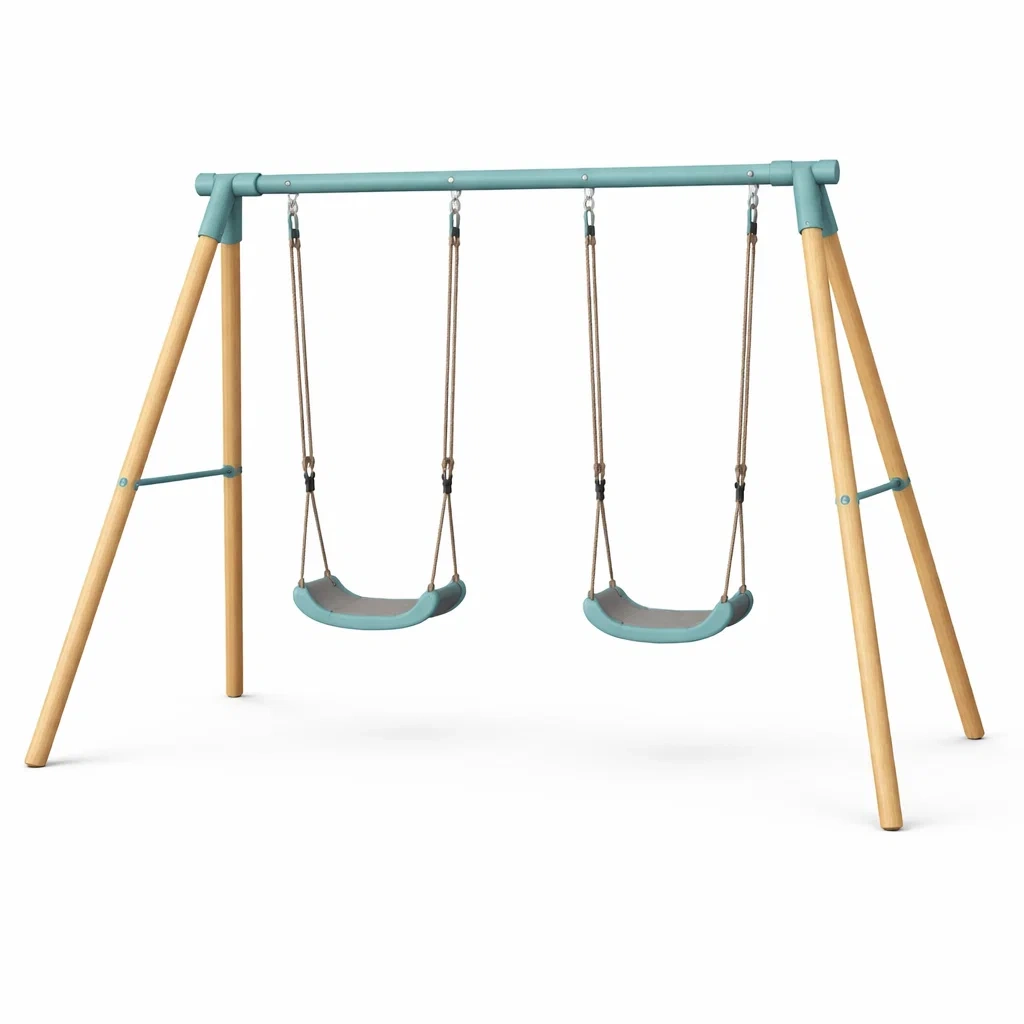 Ce portique est composé d'une structure en bois, avec des connecteurs en acier, de sièges en polypropylène et de cordes en polyester.
