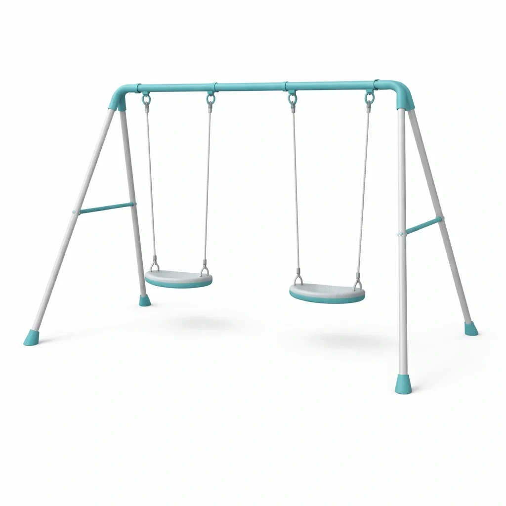 La balançoire est fabriquée en acier robuste et en polyéthylène, offrant durabilité et stabilité. Elle présente une combinaison de couleurs Bleu et Blanc.