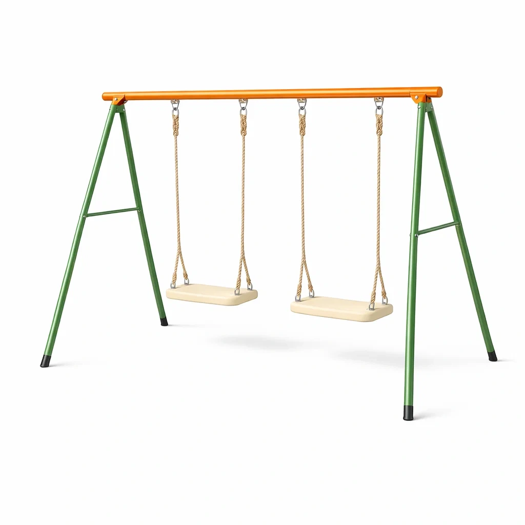 Cadre en acier robuste peint en vert avec une barre supérieure orange et des assises en plastique beige.