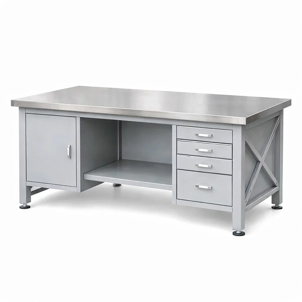 Cette table de travail est fabriquée en acier avec une surface en acier inoxydable, garantissant une résistance à la corrosion. Elle comprend trois tiroirs et un placard pour un espace de rangement optimal.
