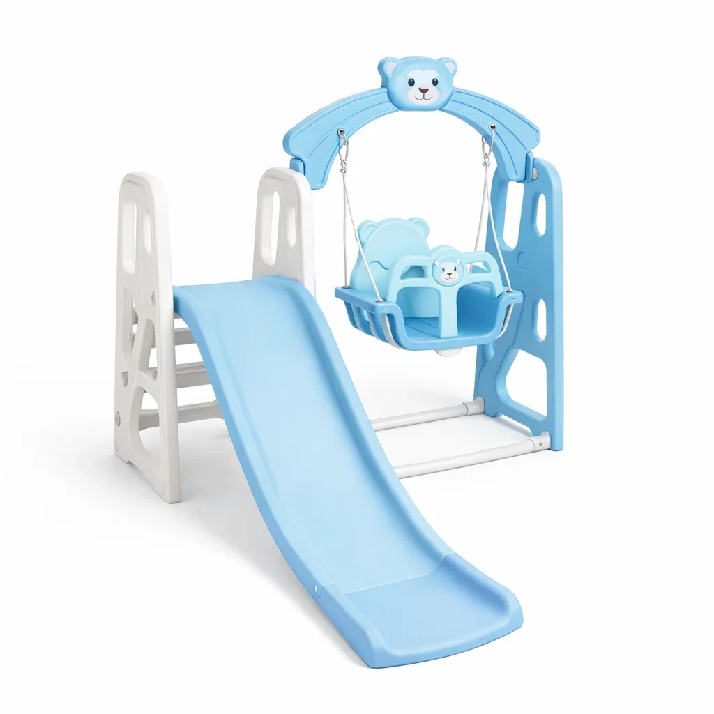 Ensemble comprenant un toboggan et une balançoire fabriqués en polypropylène (PP) robuste.